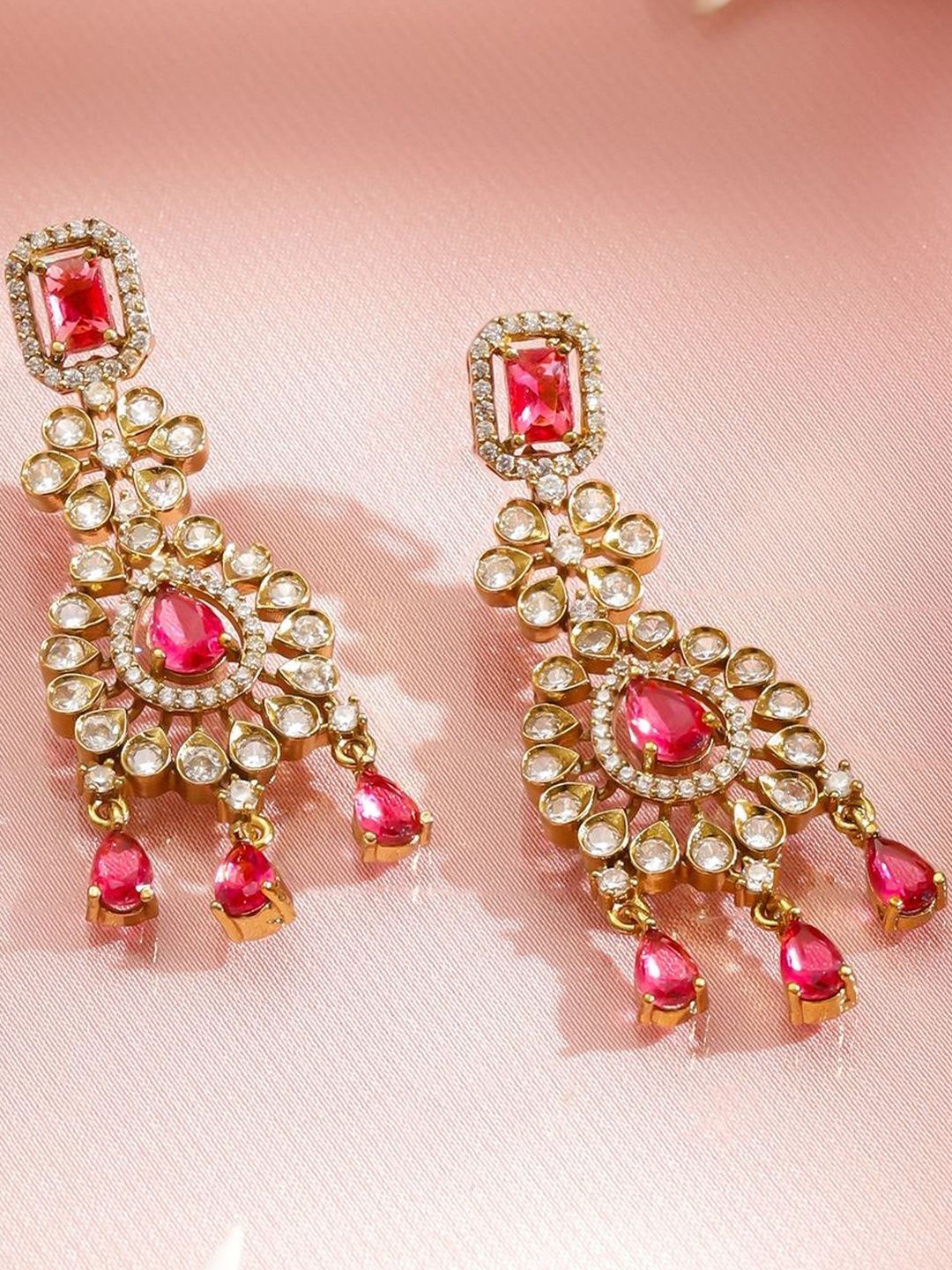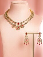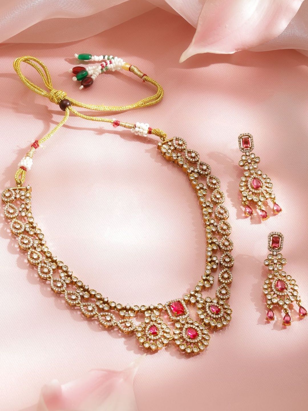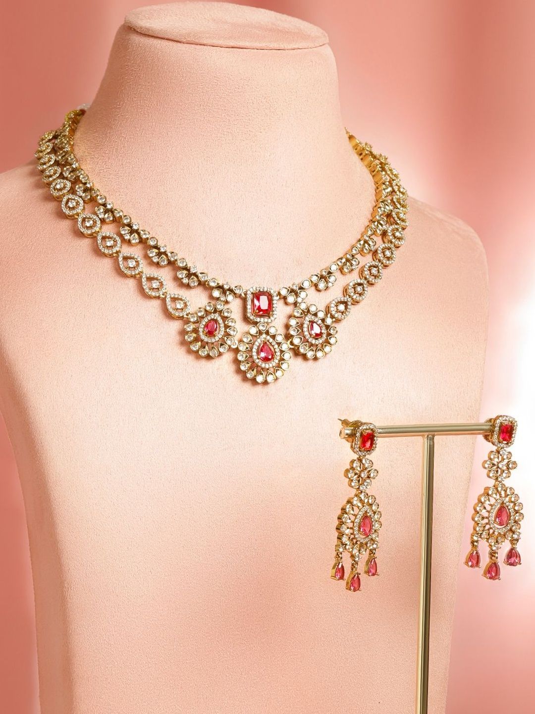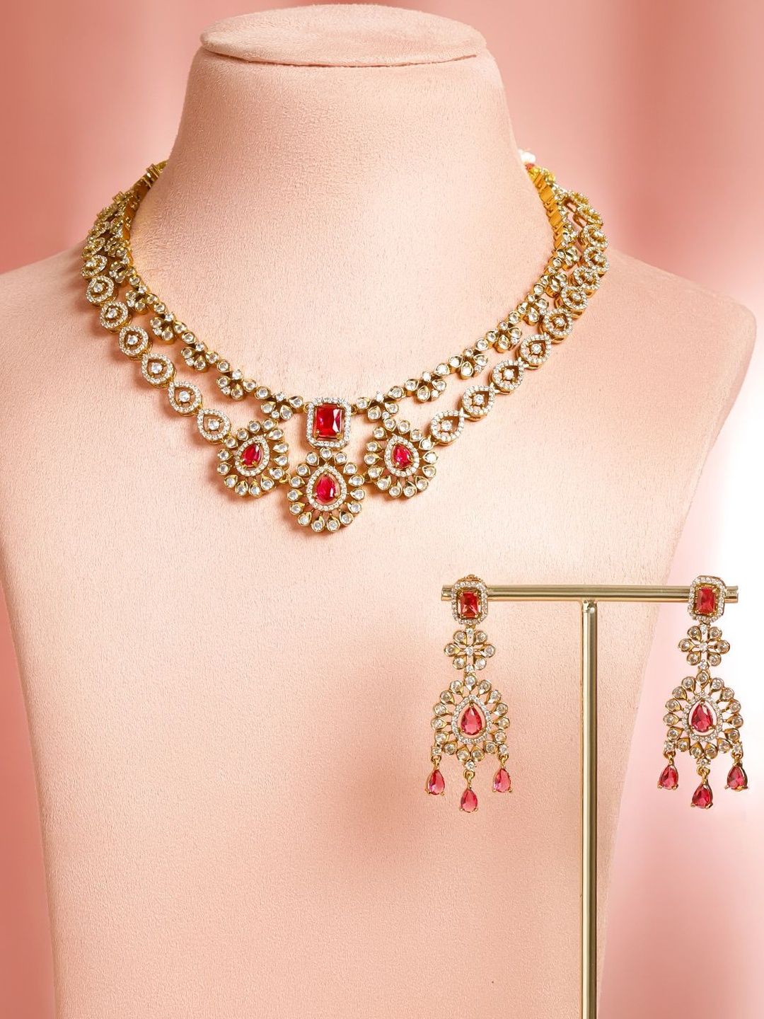 22K Gold-Plated choker necklace, has red and white stone-studded and beaded details