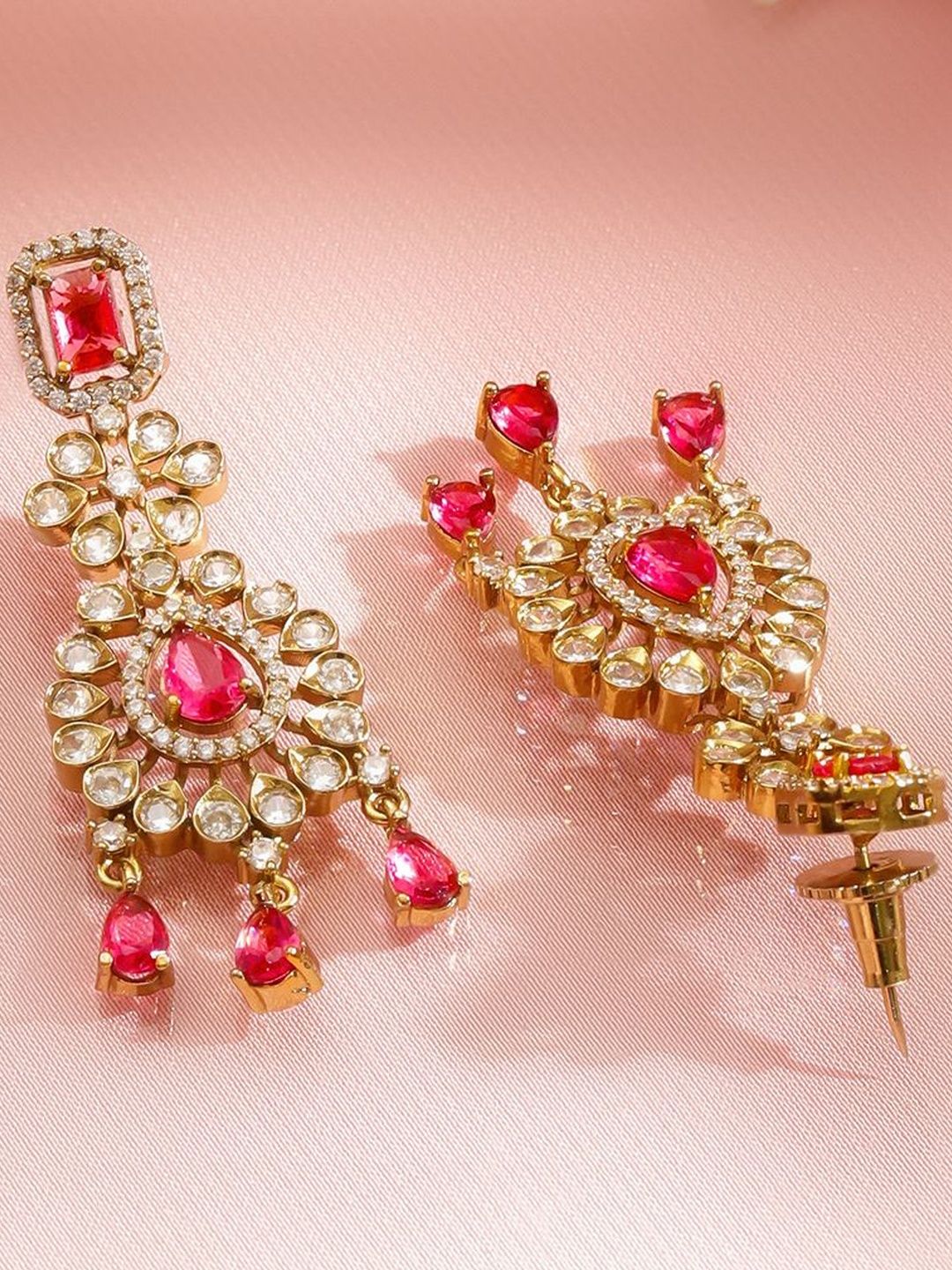 A pair of matching drop earrings, each secured with a post-and-back closure