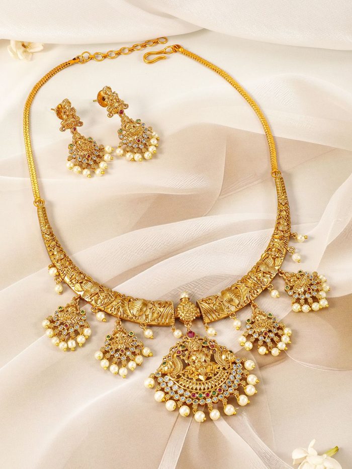 Gold-plated choker necklace, has pink and green CZ stone-studded and pearl-beaded details