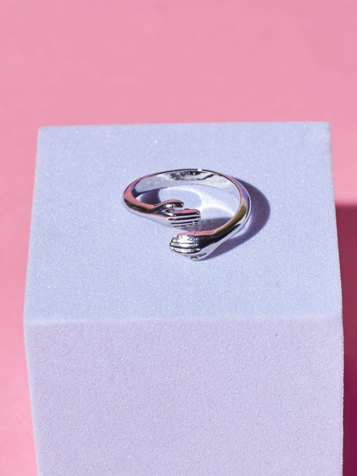 A silver toned adjustable ring, hug shaped each secured with a slip-on closure