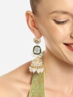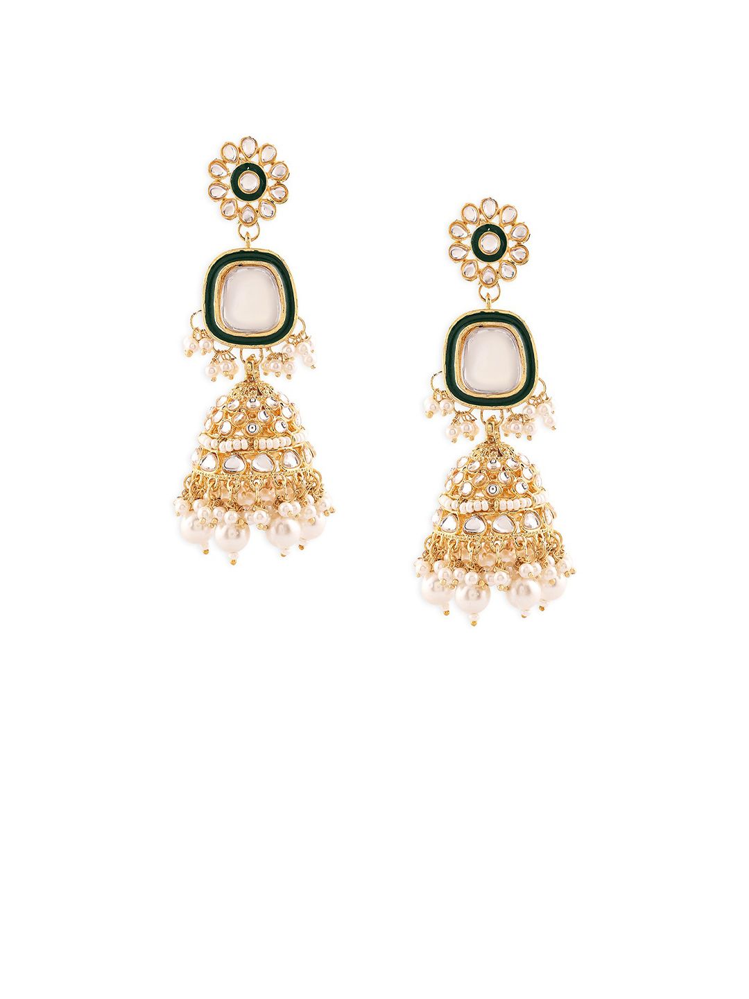 Gold-toned dome shaped jhumkas, gold-plated, has kundan