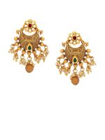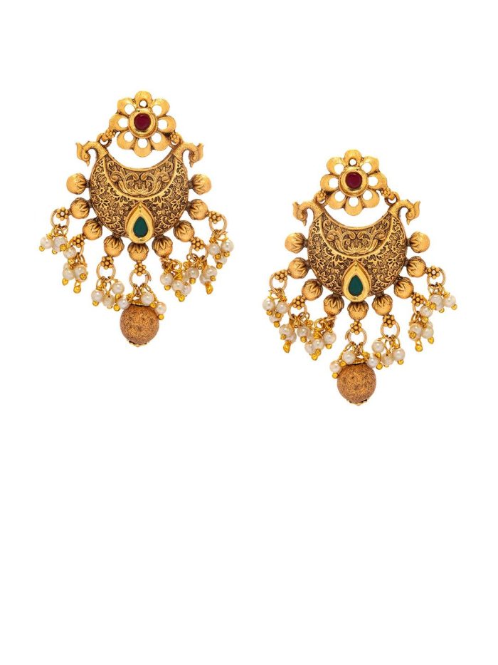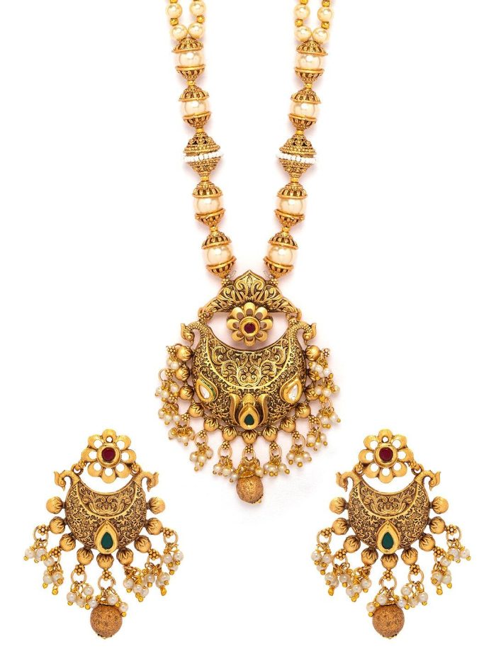 Gold-toned and green stone-studded necklace with intricate engraved detail, secured with an adjustable hook closure
