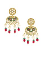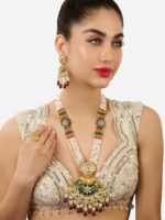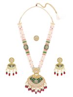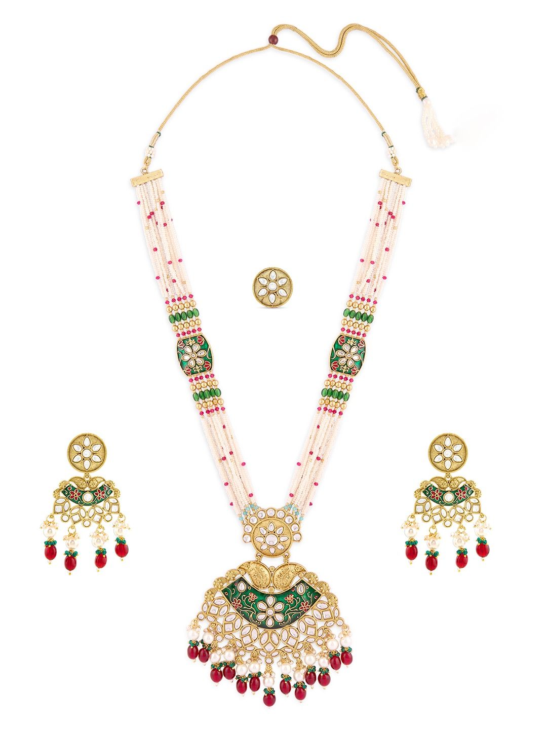 Gold-plated green meenakari necklace, has white Kundan-studded and red, pink and white beaded details