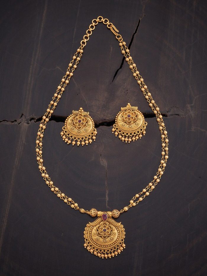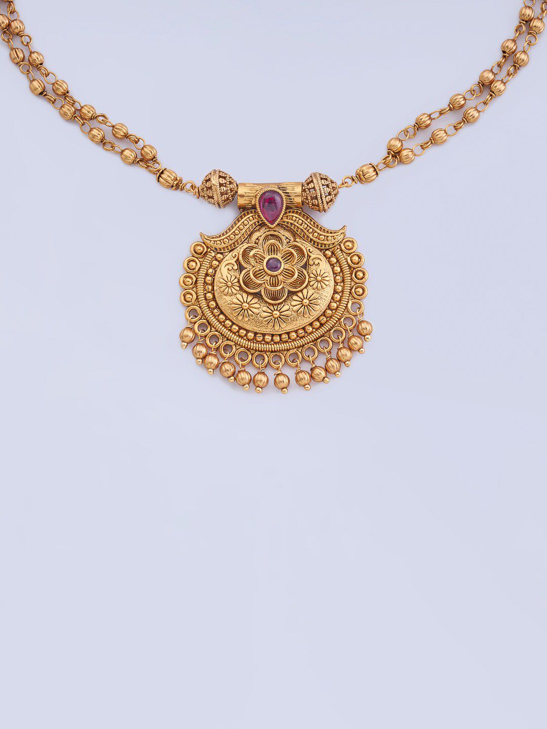 Gold-plated necklace, has red stone-studded and beaded details