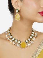 Gold-plated choker necklace, has white, yellow & green austrian diamonds stones studded Meenakari Intricate design details