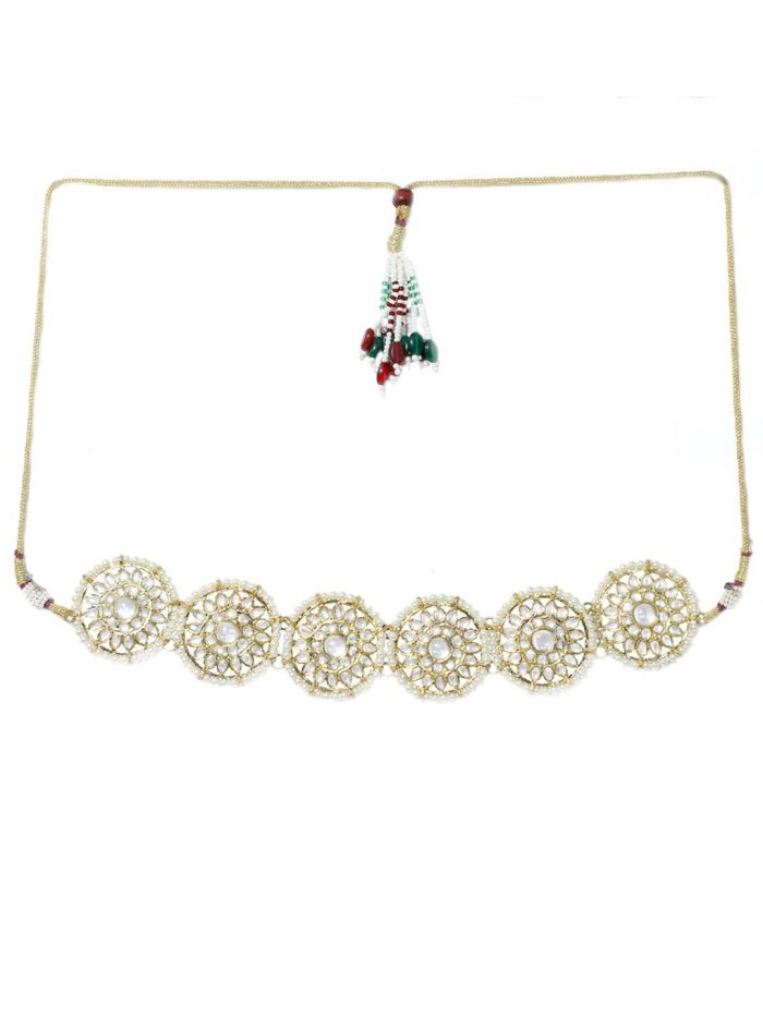 Gold-plated white kundan-studded and beaded circular brouch choker necklace, Secured with a drawstring closure