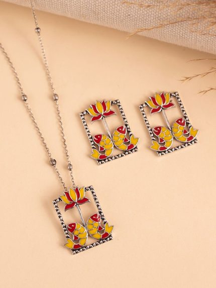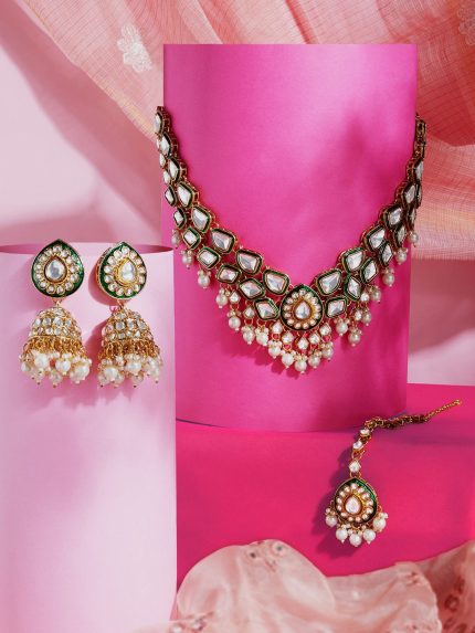 The jewellery set consists of a necklace, a pair of earrings, choker, maang tikka and kamarband