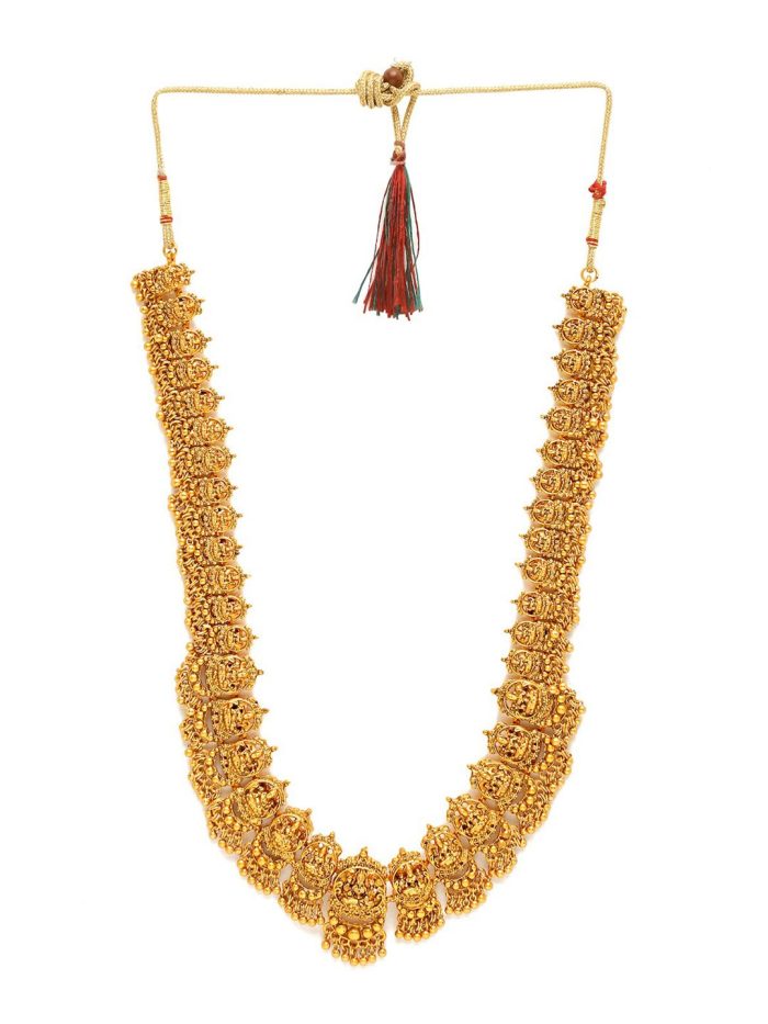 Gold-Plated temple design long necklace has intricate details and drawstring closure