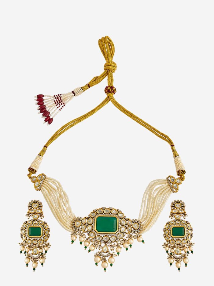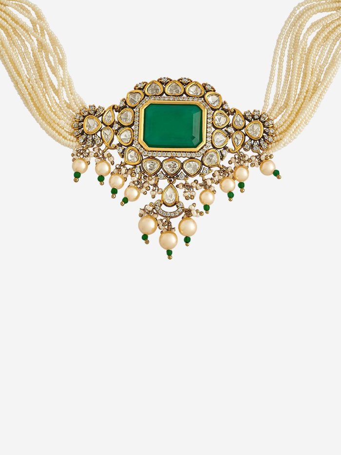 Gold-toned choker necklace, has green and white Kundan stone-studded and pearl-beaded details