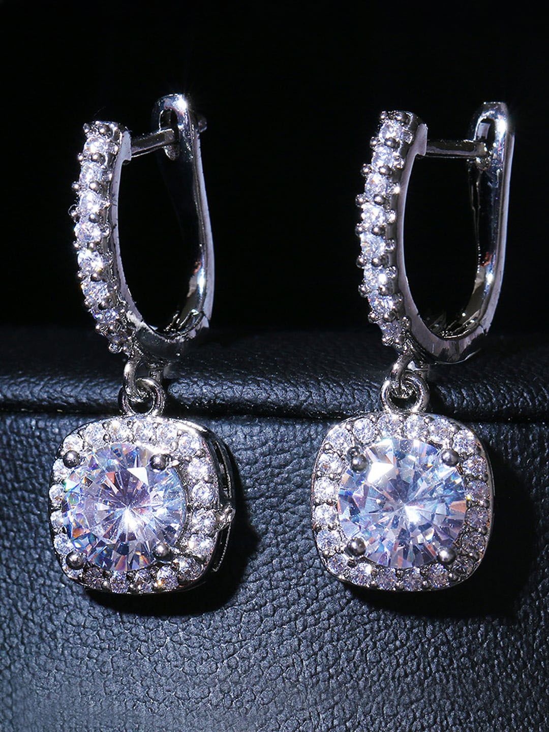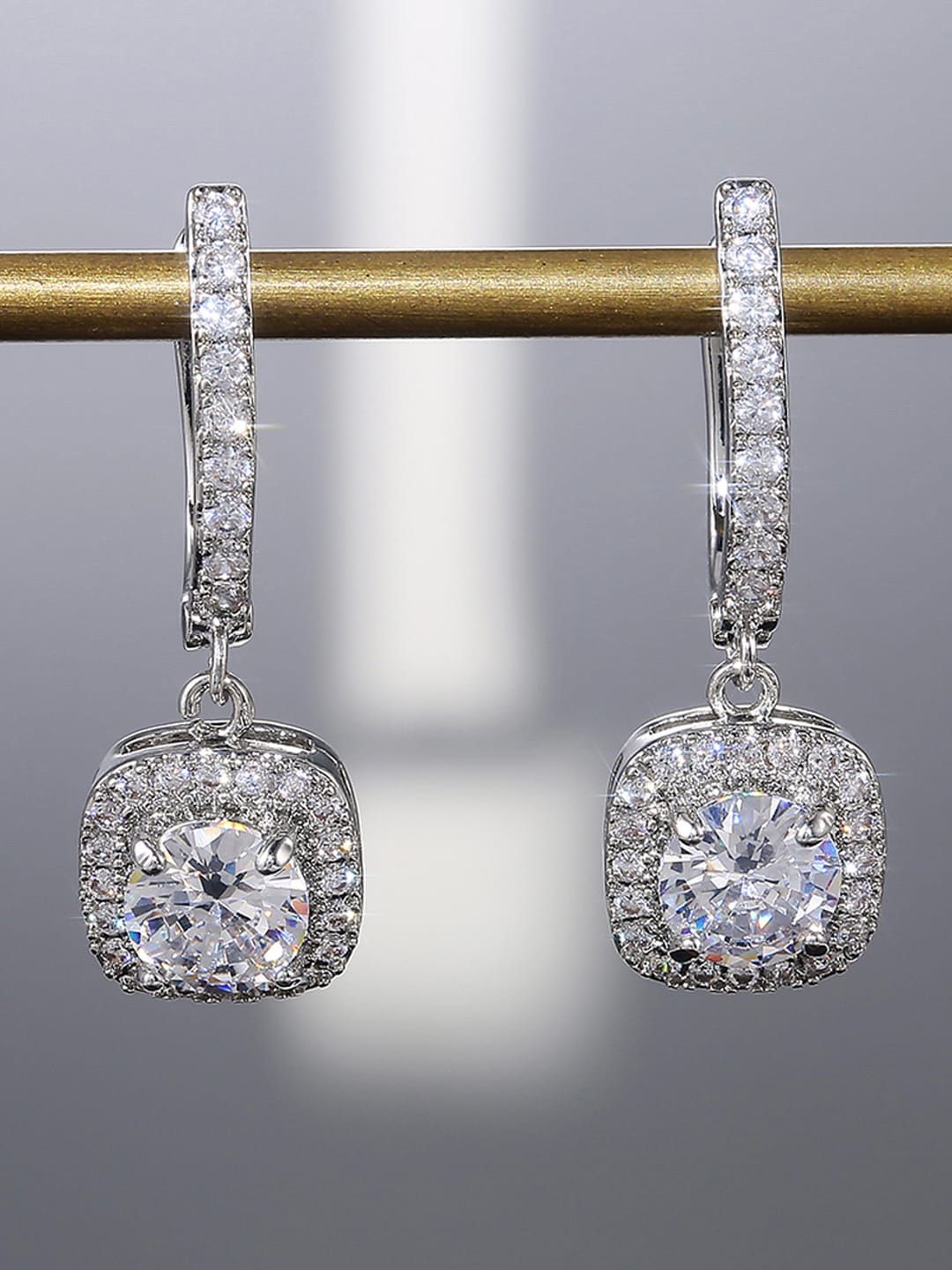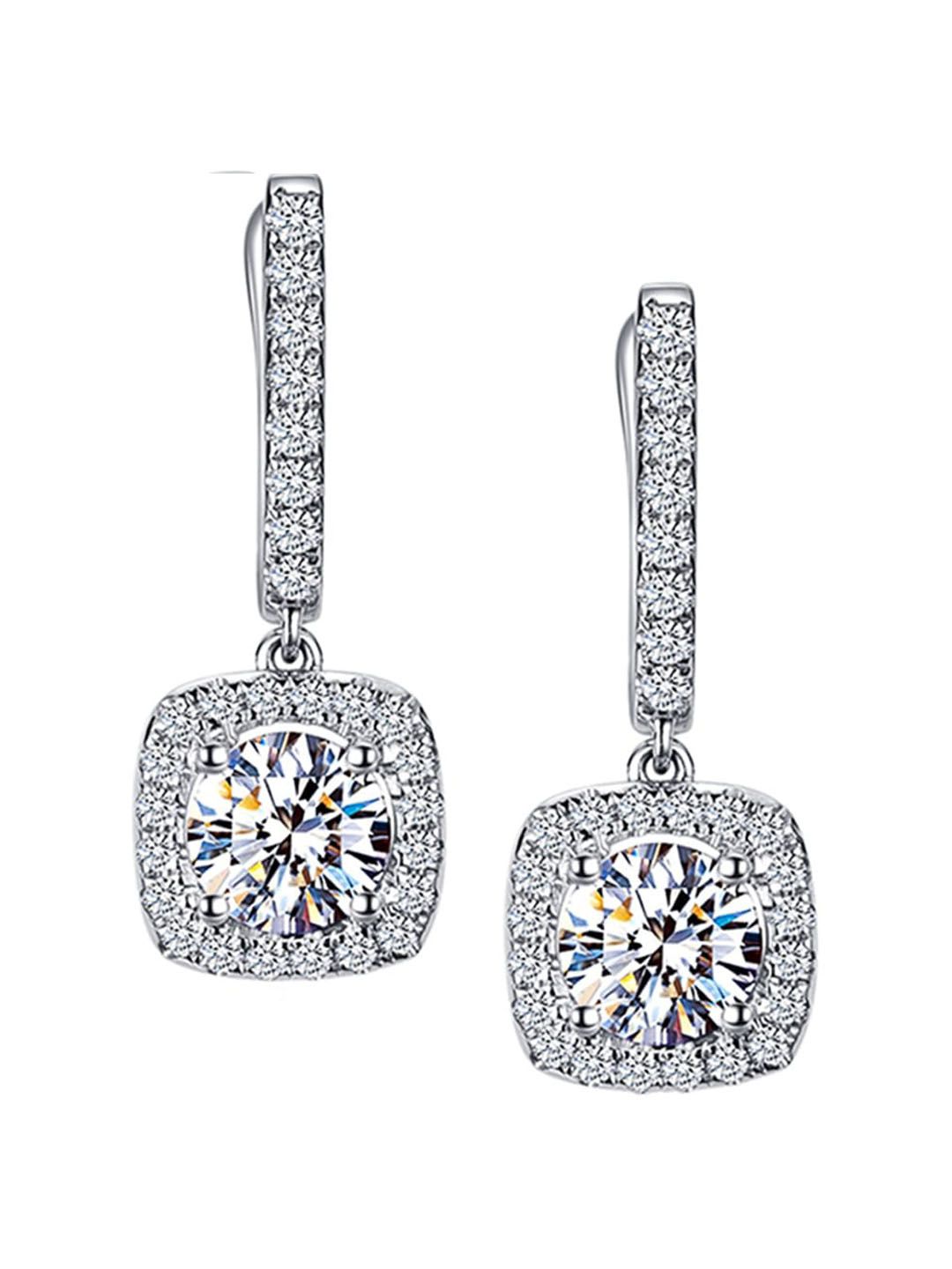Silver-toned geometric drop earrings, silver-plated, has american diamond