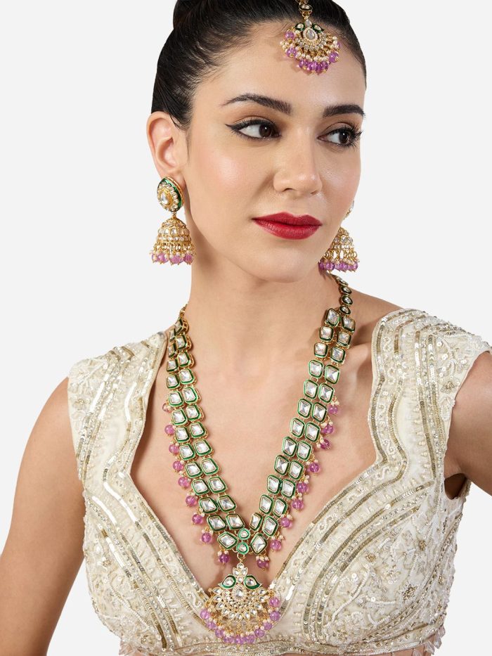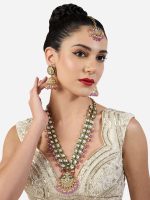 This jewellery set consists of a necklace and a pair of earrings & maang tikka