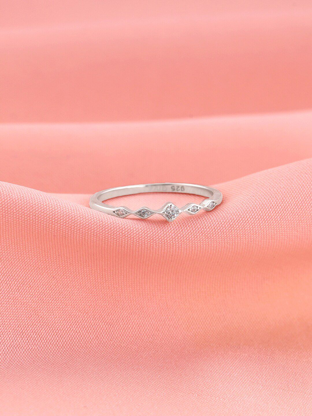 Rhodium-plated finger ring, has white stone-studded and criss-cross shaped details
